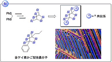 シクロアルカンの環を構成している炭素の一部をケイ素に置き換えたポリシラシクロアルカンを設計し、これを合成するための新方法を確立しています。炭素-ケイ素σ結合が橋頭位に導入した置換基のσ結合やπ結合と共役する事実を見つけ、新しい光機能および電子機能を有する有機材料の創製を進めています。