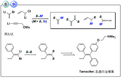 ケイ素-ケイ素、ケイ素-ホウ素、ホウ素-ホウ素結合などのヘテロ原子間結合をカルベノイドや遷移金属錯体触媒を用いて活性化して、新たに複数の炭素-ヘテロ原子結合を形成する新合成反応を開発しています。