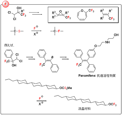 フッ素はハロゲン元素のなかでも異色であり、反応不活性と化学安定性を示すだけでなく、機能分子として特別の性質をもたらすため、注目を集めていますが、合成法に制約がありました。これらフッ素化合物を合成する新しい方法として、フッ素と金属の相互作用を利用した含フッ素化合物の立体選択的合成法や、炭素-イオウ結合を活性化して炭素-フッ素結合に変換する反応(酸化的脱硫フッ素化)を開発しています。